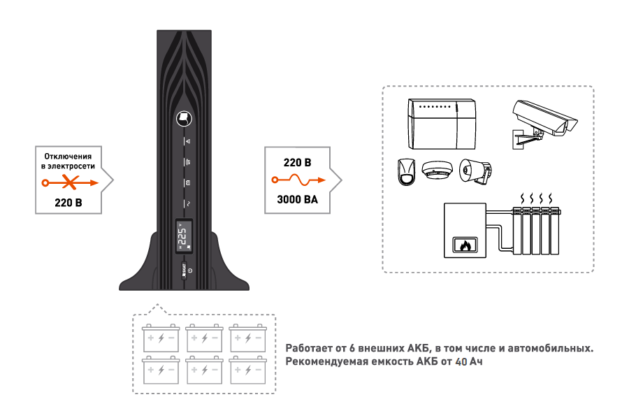 Масштабируемость: Вы сами выбираете емкость АКБ (от 17 до 120 Ач и более), определяя время автономной работы — от нескольких минут до целых суток.